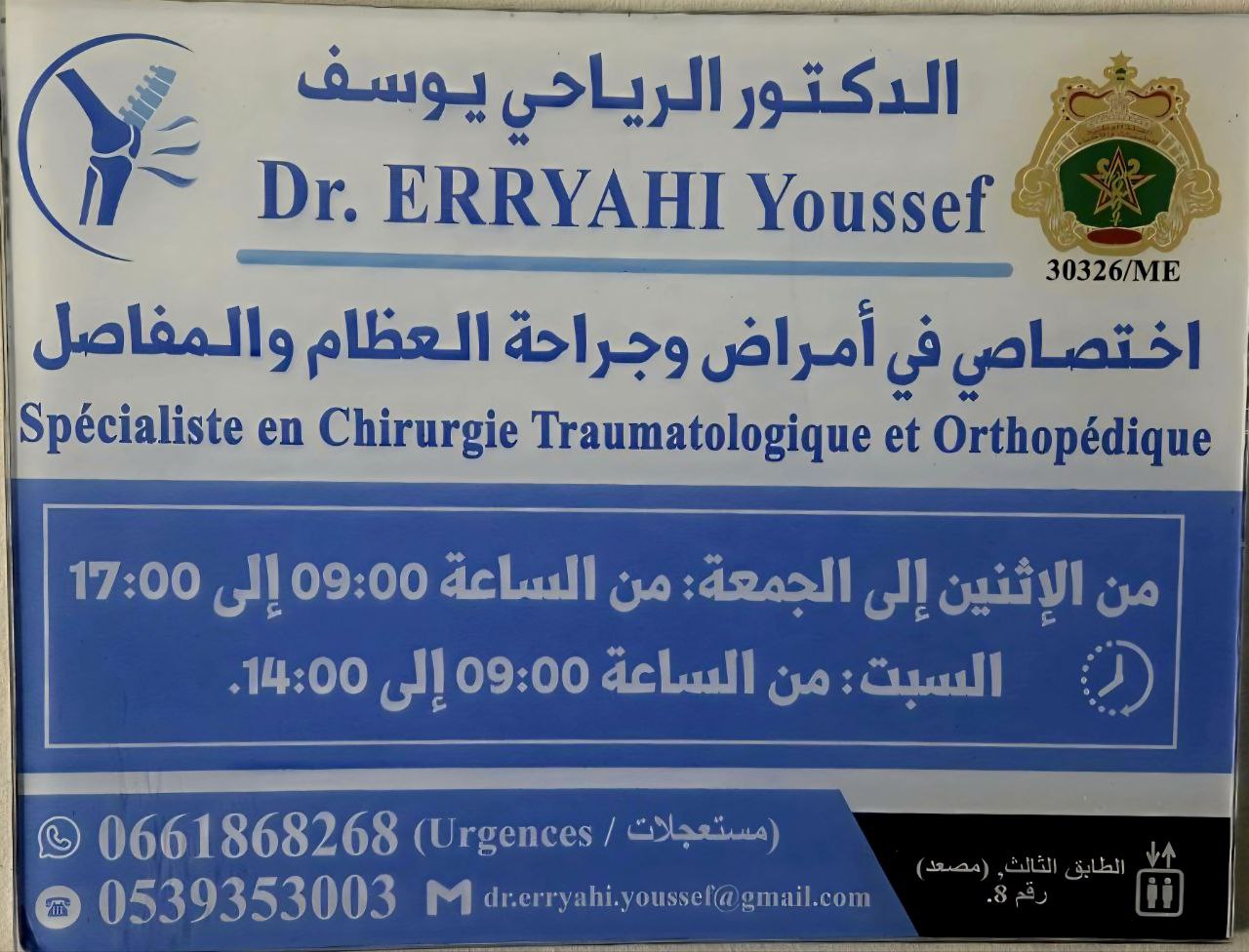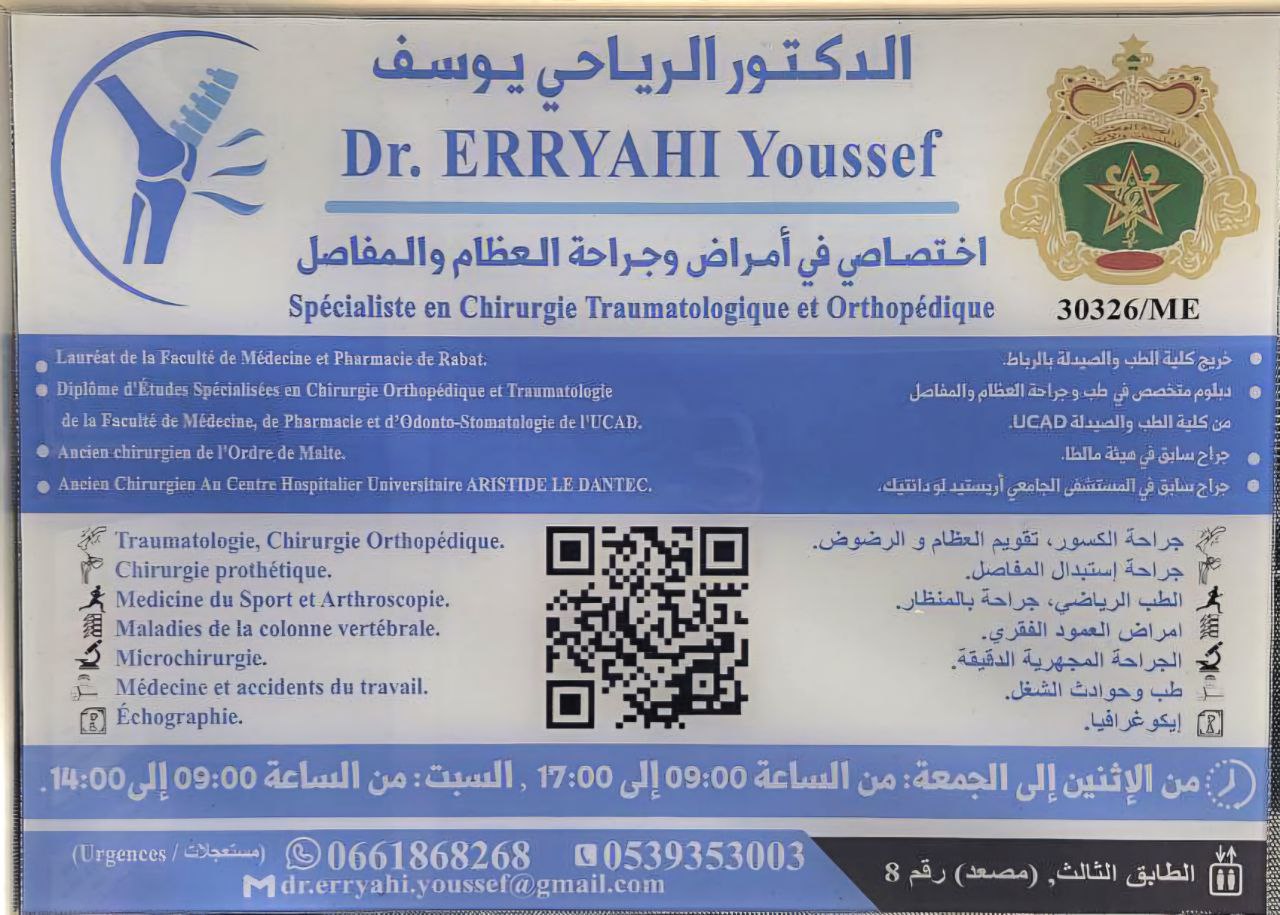 Je recommande vivement le Dr Erryahi à tous ceux qui cherchent un chirurgien traumatologue très compétent et de confiance. Le cabinet est un modèle de propreté et de modernité, avec un équipement de pointe. Les rendez-vous sont respectés avec ponctualité. Les résultats sont là pour en témoigner, et je peux personnellement attester de la qualité de ses soins.